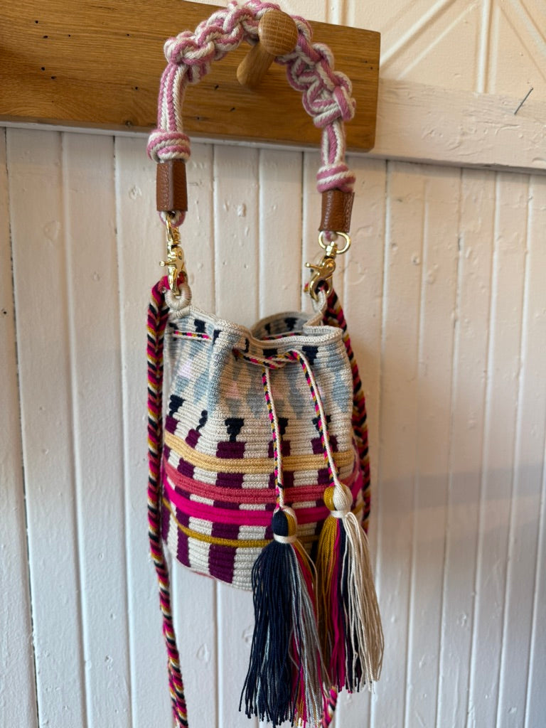 Crossbody Bag M with short macrame handle - Navy and Pink