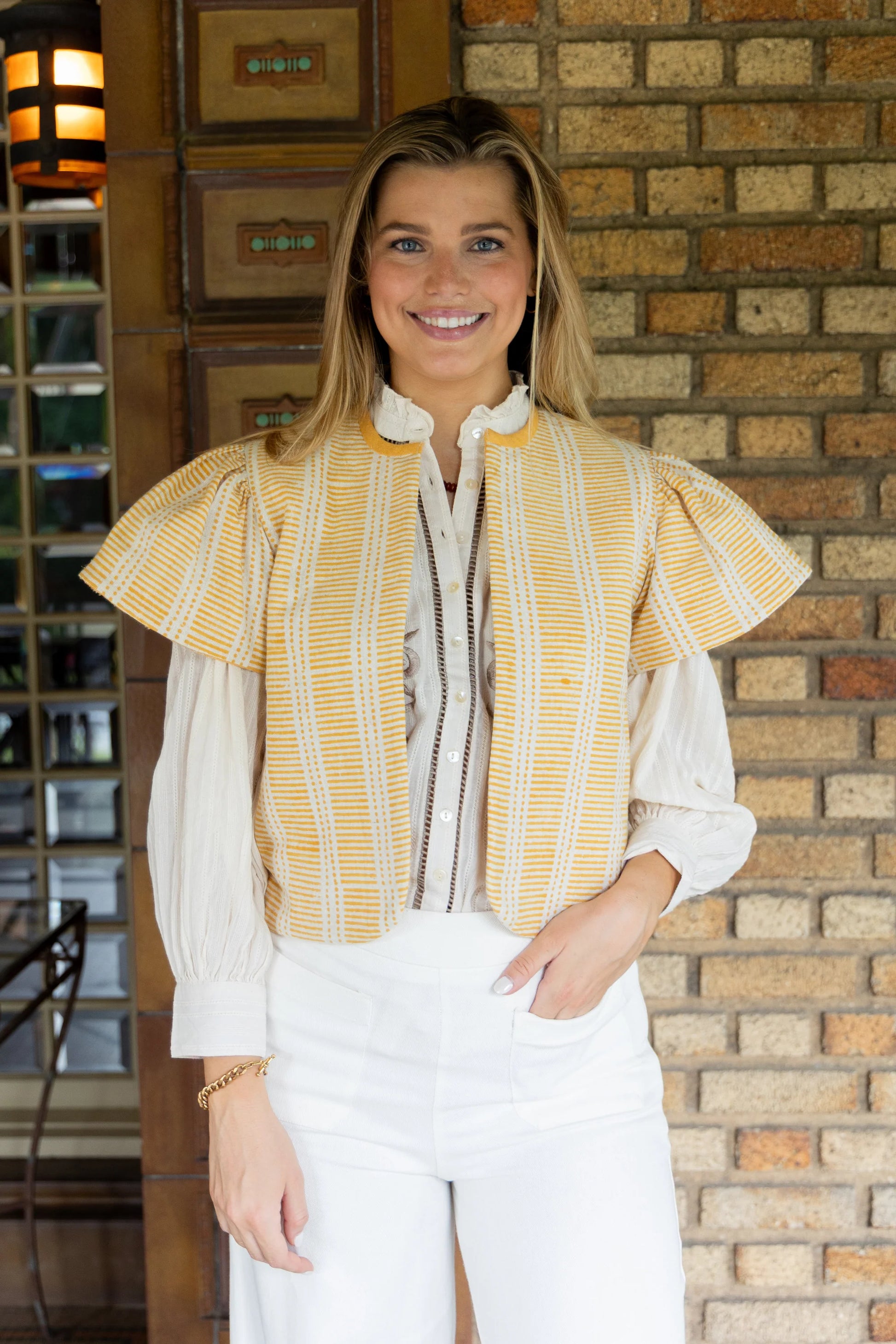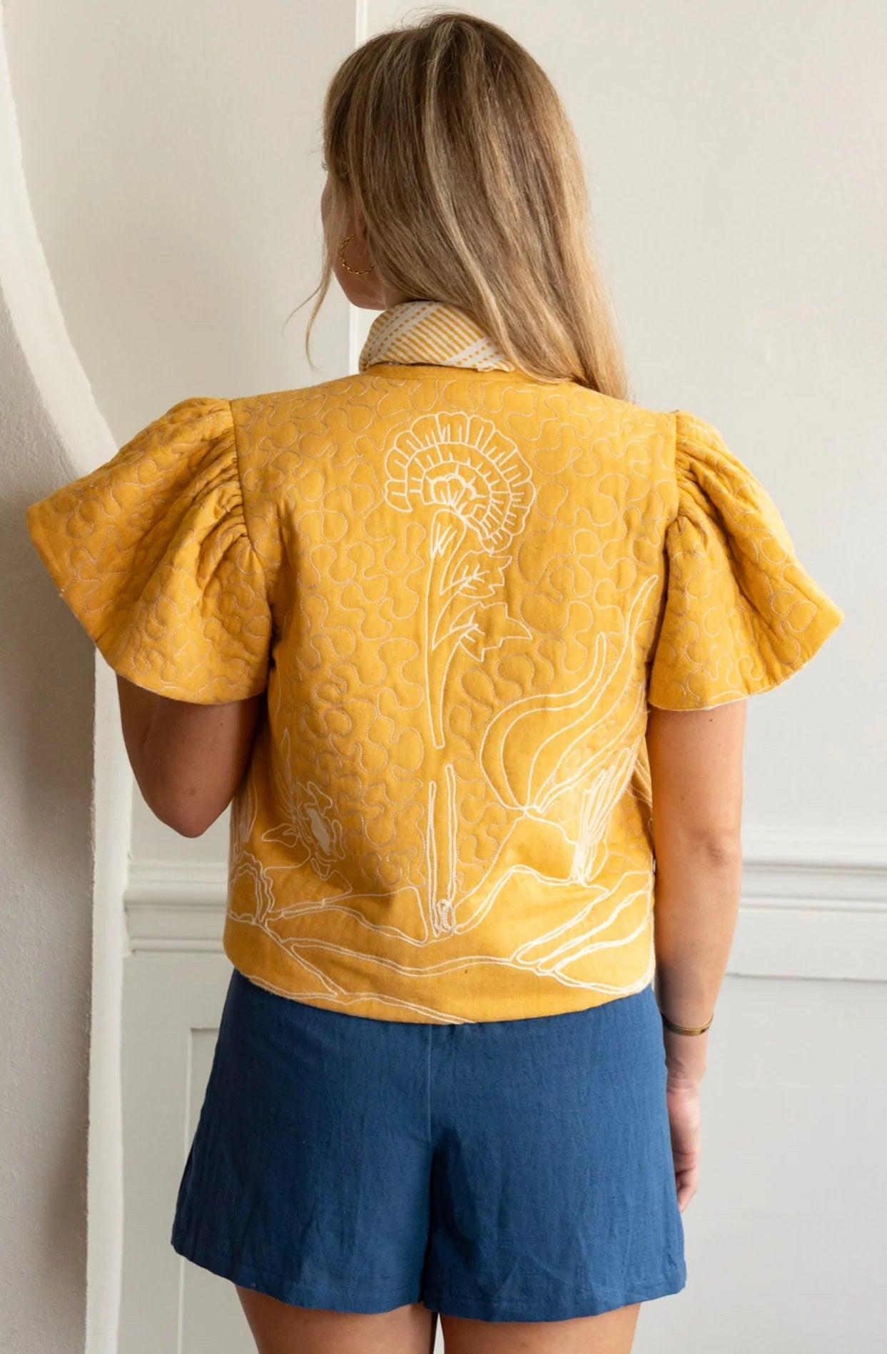 The Darby Reversible Vest, inspired by a vintage design, offers versatile elegance with its soft amber yellow cotton fabric. One side showcases delicate embroidered flowers, while the reverse features a refined handblock print of lines and dots. With graceful flutter sleeves and a flattering hip-length cut, it layers beautifully over tanks or long sleeves. Perfect for transitioning seamlessly from fall through spring and summer, this vest invites you to express your unique style with effortless sophistication.