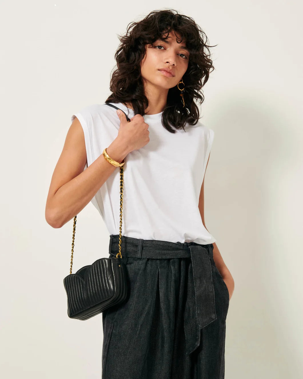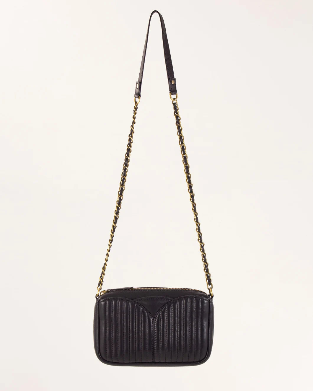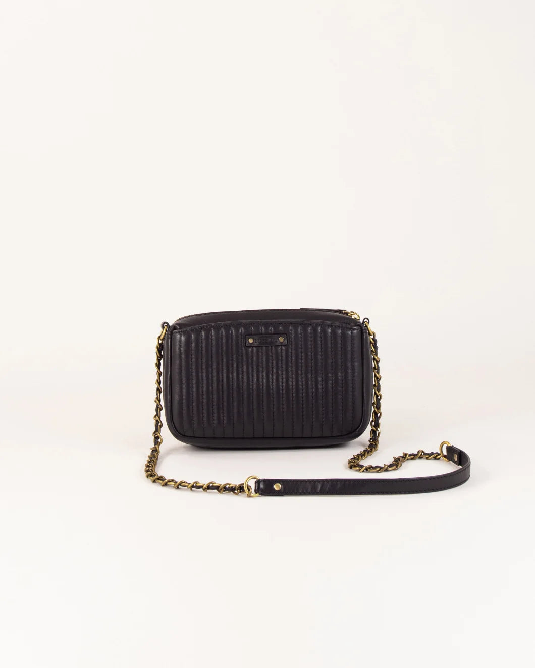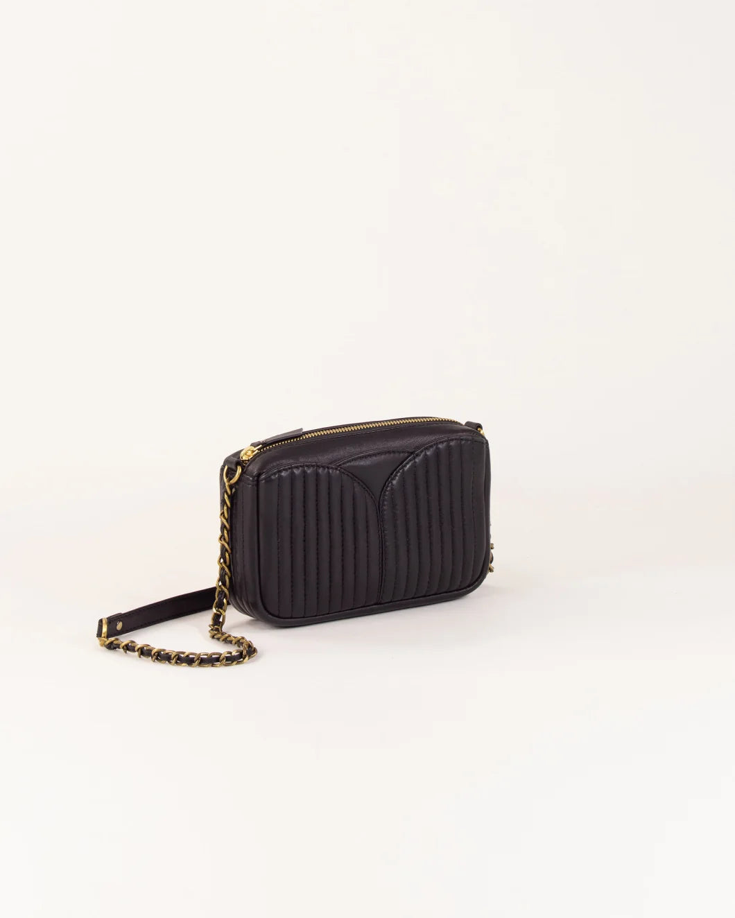 Crafted from quilted lamb leather with elegant topstitching, the Divinou Small Crossbody Bag offers refined sophistication. Its antique gold-finish hardware and metal zip closure complement the luxurious design. Featuring a spacious central zipped compartment alongside two large exterior pockets, it provides organized storage for essentials. The 105 cm chain strap allows versatile wear, while the soft cotton lining ensures durability and a polished finish.