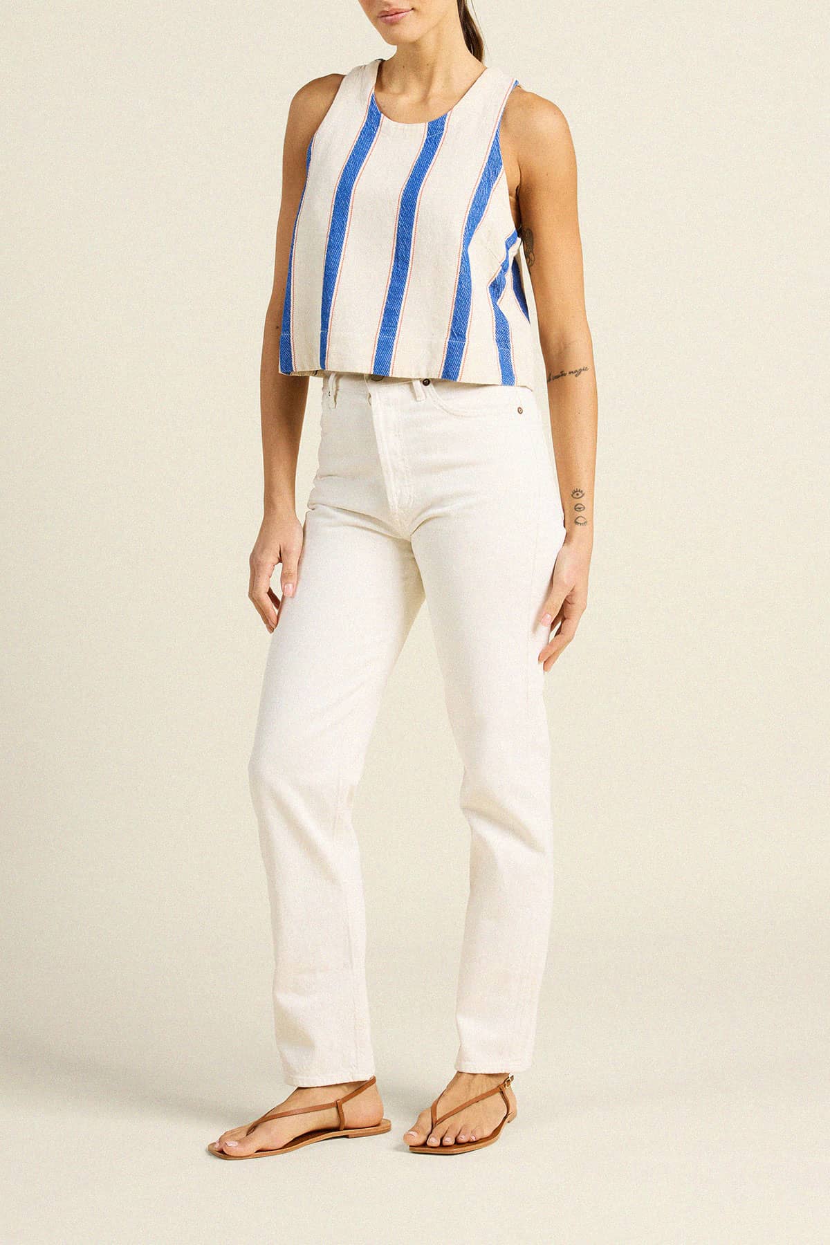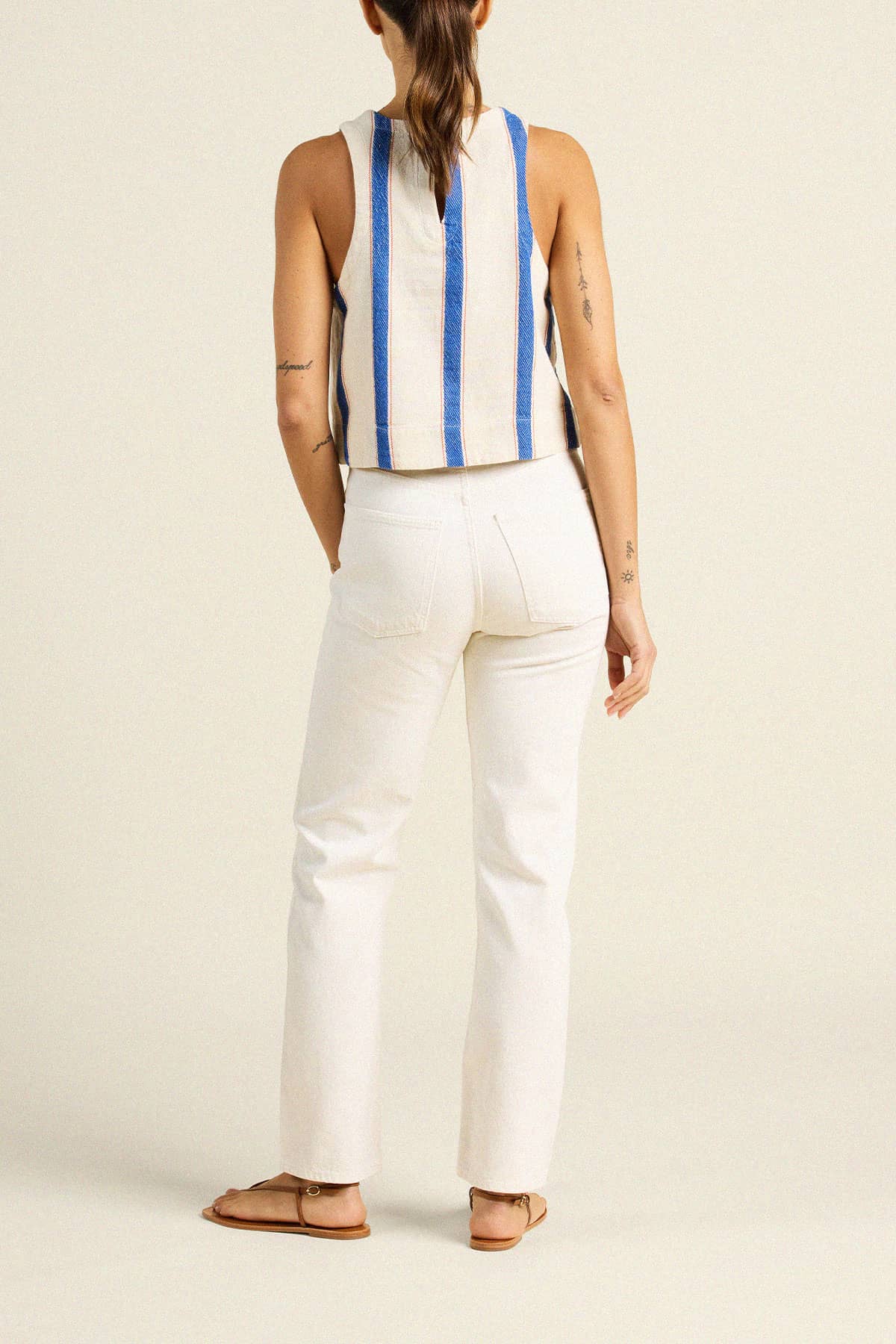 The Ester Tank in Awning Stripe offers a refined take on summer essentials with its slightly cropped fit and rounded neckline. Tailored from lightweight cotton twill, it features a buttoned back closure, bust darts, and seamless construction for a sleek silhouette. Perfect alone or paired with our linen trousers or shorts, this versatile piece blends modern design with classic appeal, creating an effortlessly polished look ideal for warm weather. So cute!