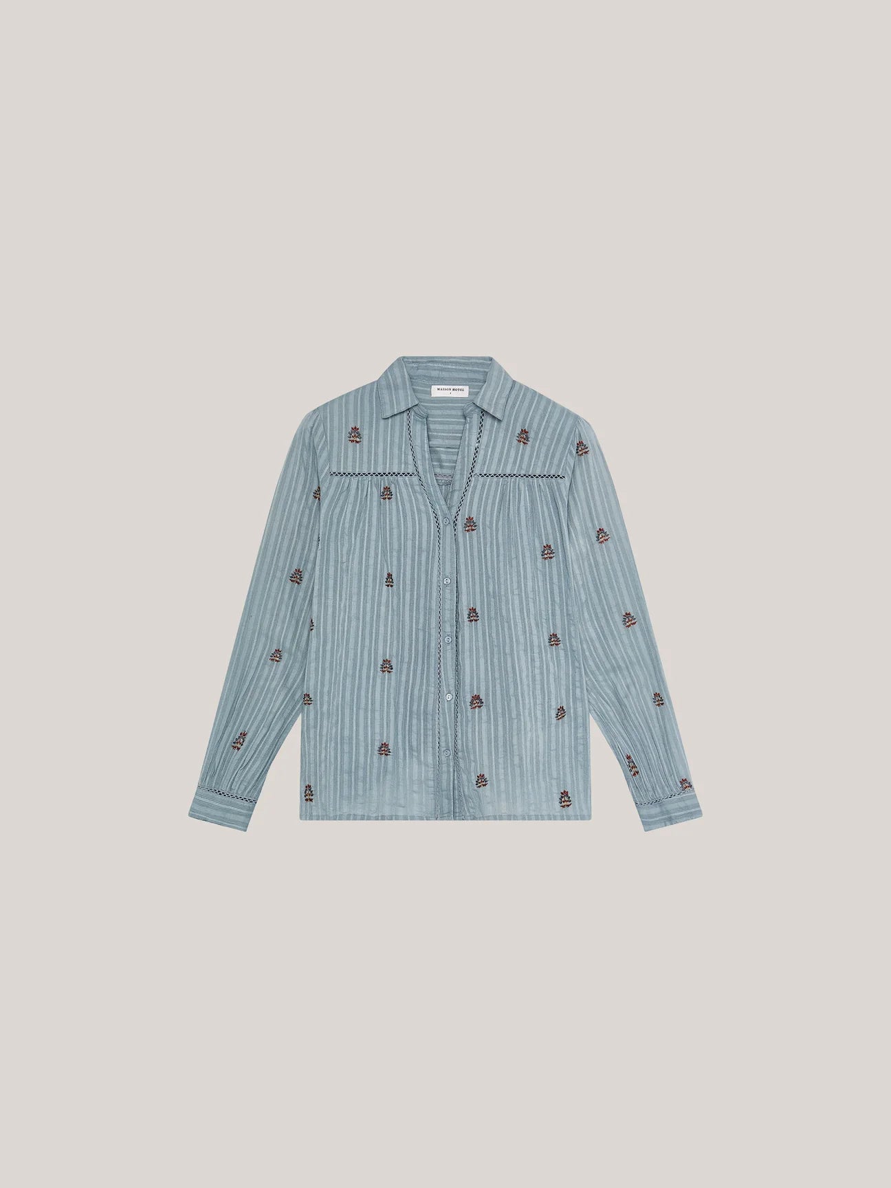 The Genesis Amrit Top in Dusty Blue features a refined cotton dobby fabric with a subtle stripe, offering a lightweight feel with elegant structure. Its soft greenish-blue hue evokes the serene beauty of pressed eucalyptus leaves. Delicate embroidery clusters adorn the chest and sleeves in warm floral shades, lending a handcrafted touch that is both understated and intimate. Perfect for those seeking a sophisticated yet effortless style.