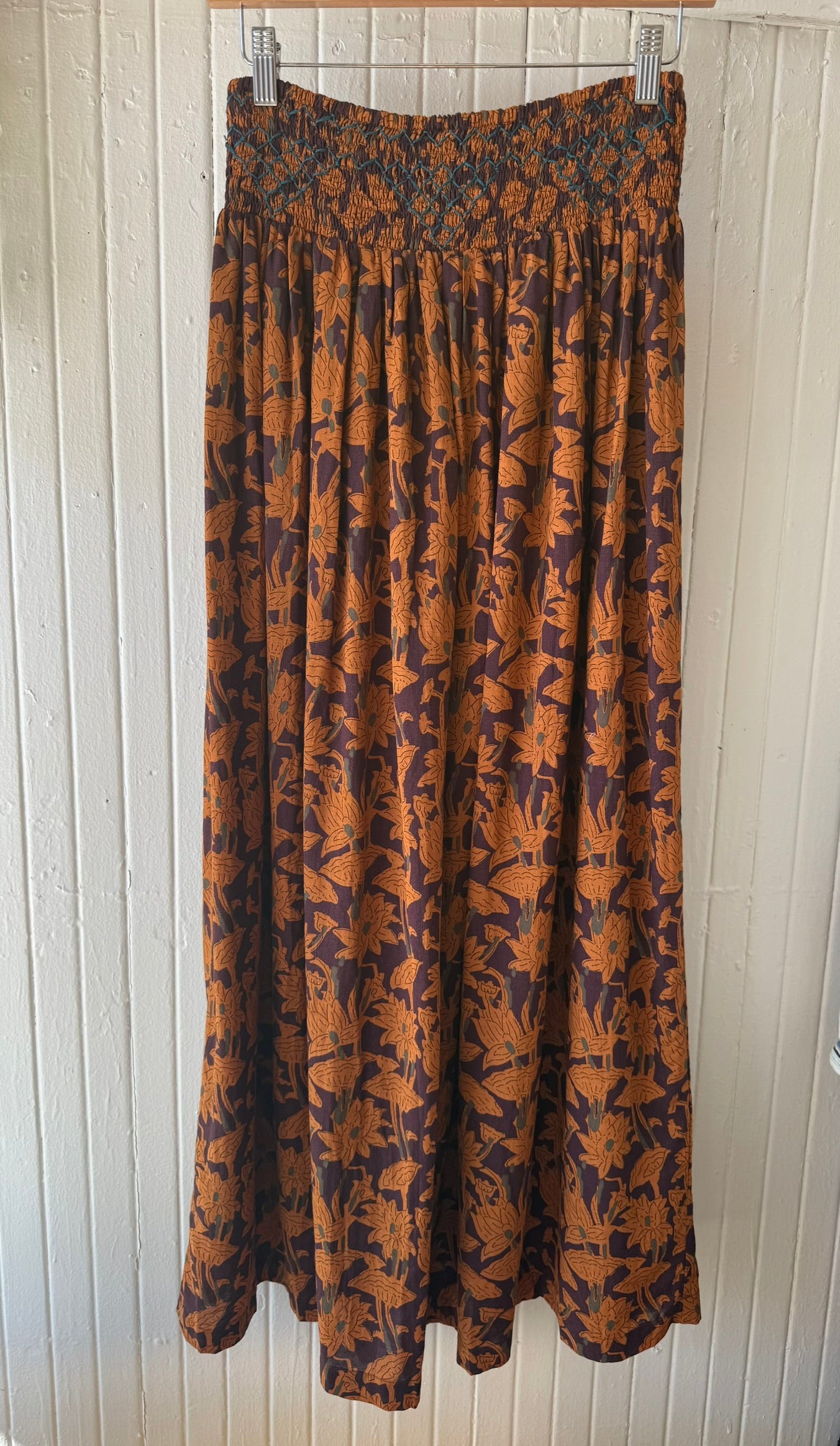 The Mia Maxi Skirt offers effortless versatility in a one-size design that adapts to your style and fit. Featuring a beautiful Fall orange block print with delicate teal embroidery at the waistband, this skirt can be worn casually with sandals or elegantly paired with heels. Adjust the length easily by sliding it up or down the waist for a custom look that complements any occasion.