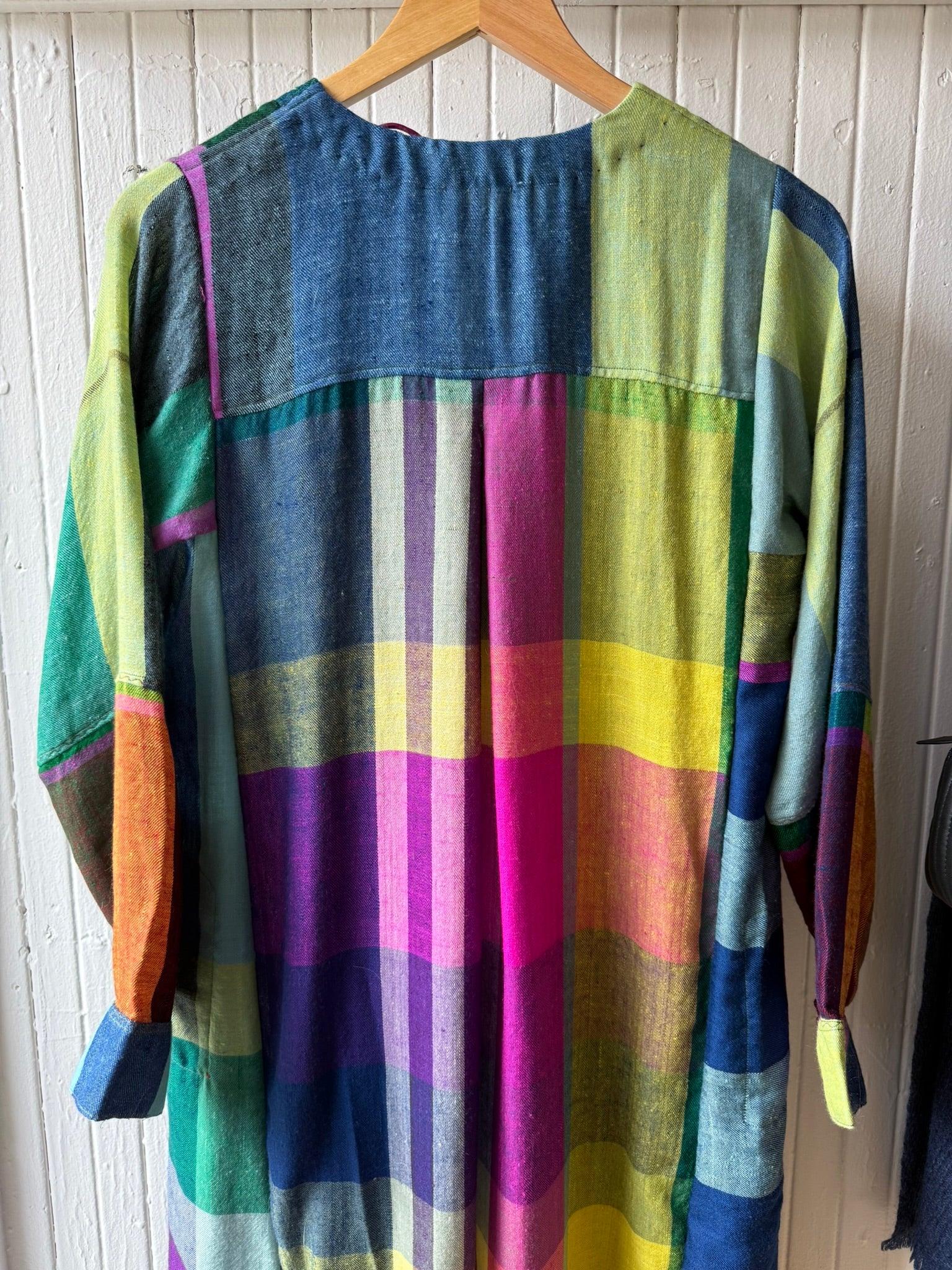 The Miraj #55 Jubilee Dress is a celebration of refined craftsmanship, handmade in India from luxurious 100% cashmere. This ankle-length design features a sophisticated round neckline, fabric ties with delicate tassels, and front button closure. The fitted bodice showcases fine detail stitching with gathered gathers at the high waist, while long sleeves finish with button cuffs. Practical side seam pockets and vibrant multicolored tones add both function and visual interest. Dry clean only to preserve its exquisite quality and softness.