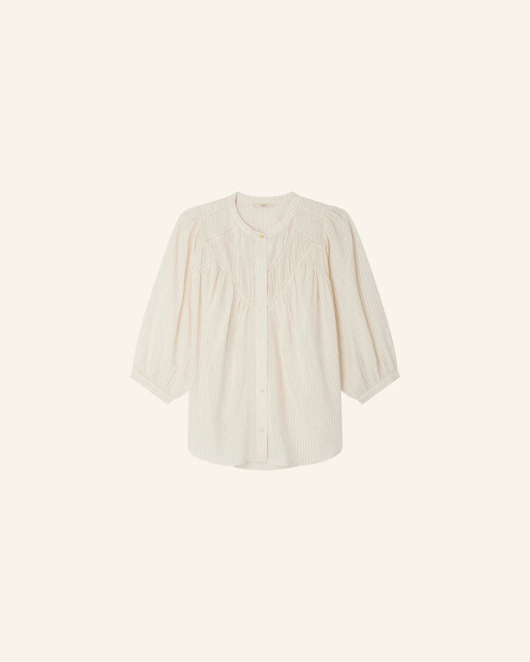 The Savi Blouse in Sand Black features elegant balloon sleeves and refined ladder openwork combined with delicate mini knife pleats, all crafted from textured jacquard lawn fabric with subtle contrasting stripes. Made from sustainably sourced viscose, it offers a soft, breathable feel. Designed with a round neck and a jewel button closure at the collar, the blouse is completed by sophisticated gathering details at the armholes and front, creating a flattering silhouette perfect for polished, modern wardrobes.